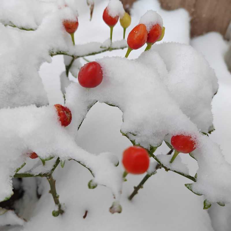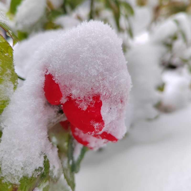 花儿和果实还没来得及和秋天说再见,就迎来了冬雪的光临,在皑皑白雪的映衬下,显得格外鲜艳。