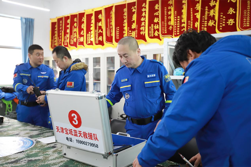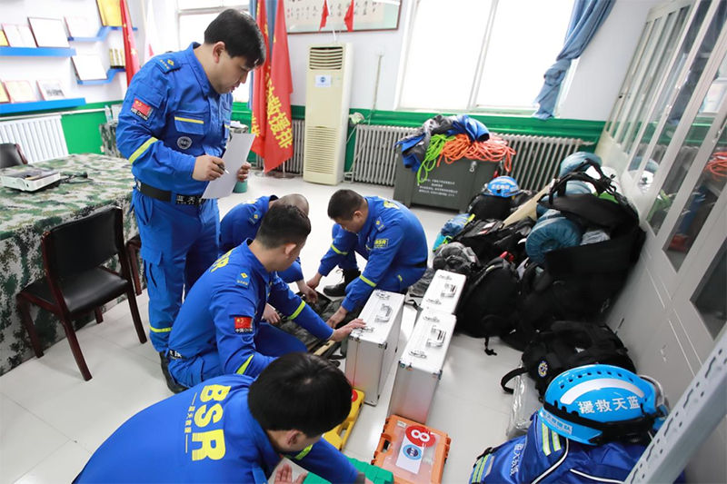 2月10日上午10点,在宝坻区红十字蓝天救援队队部,队员们正在整理装备。此次救援队携带的装备包括地震救援、现场急救、生命探测仪器等设备。