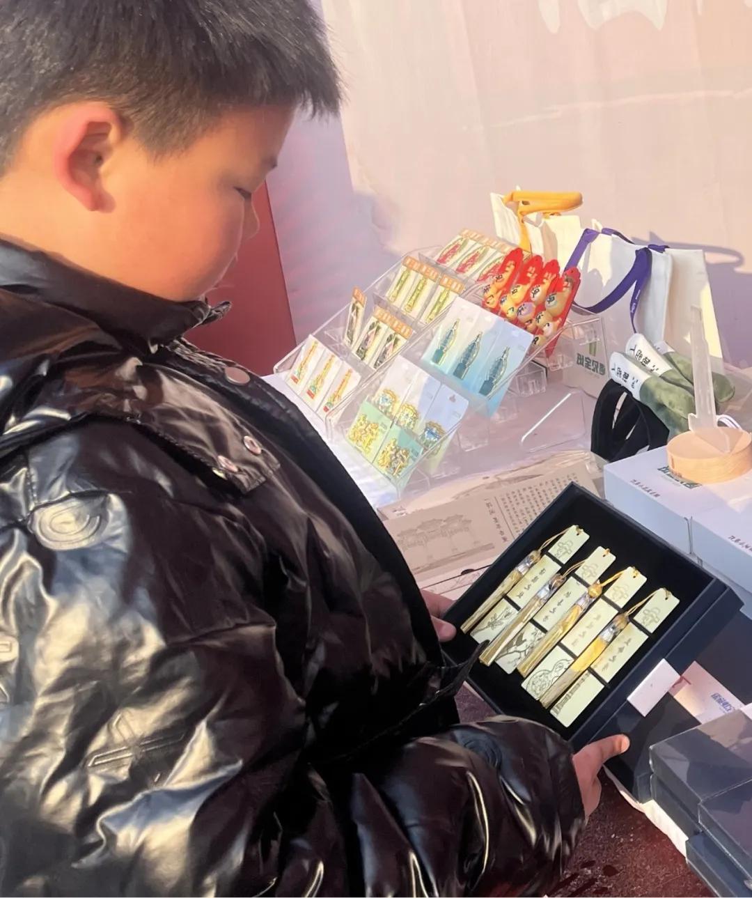 看到带有宝坻三辣之一——五叶齐大葱的发饰,不少小朋友忍不住都要试戴一下,瞬间化身“葱明人”。还有的游客将带有宝坻特色景点的冰箱贴收入囊中。印有“金榜题名”“了凡赐福”字样的笔墨套装也颇受市民和游客喜爱,带上一套回家,祝福满满、寓意美好。