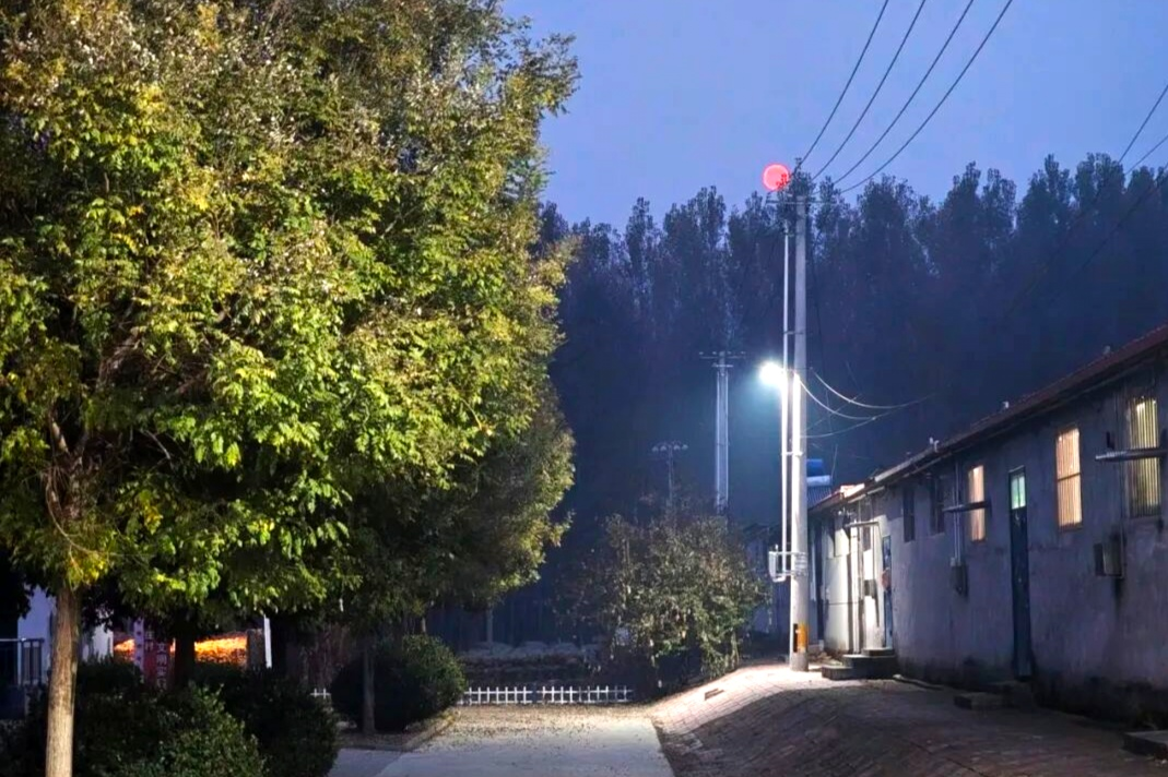 夜幕降临,口东镇黄辛庄村的路灯准时亮起,柔和的光晕驱散了巷道与路口的黑暗,也照亮了晚归村民脚下的路。