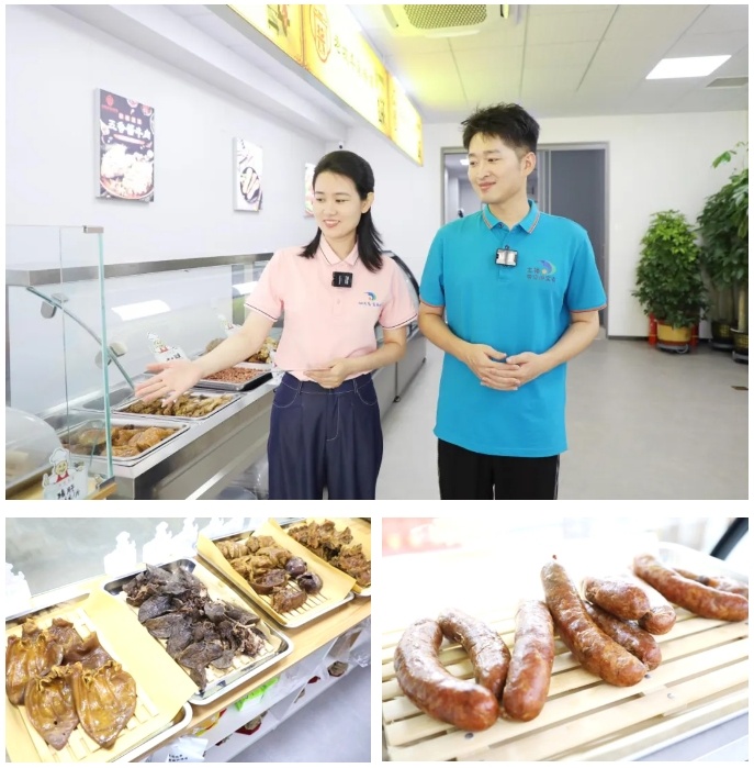 店里正在摆盘,融媒主播红薇和小崔一进门,就被肉香吸引了。穿过销售区域,制作区的食材、设备、制作过程都一目了然,让顾客们放心。
