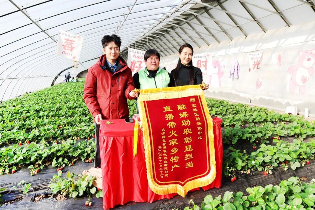 “圣诞红”浓郁的香味惊艳了晓晨和小崔,比草莓更红的是闪亮登场的锦旗“融媒助农彰显担当 直播带火家乡特产”。肖丽娟动情地说:“不光是我们晶宝农庄的草莓通过直播受到越来越多顾客和游客的喜欢,宝坻还有很多好的农产品通过直播让更多人看到,非常感谢宝坻融媒直播团队的付出。”