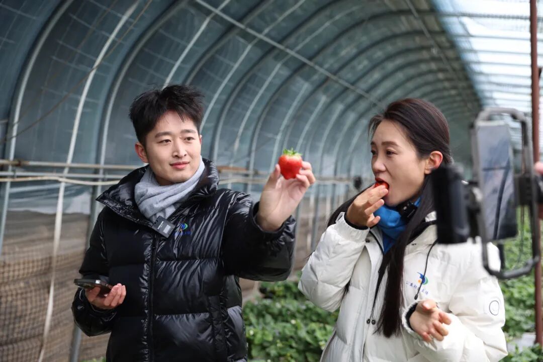 “棚内温暖如春,这里安装了控温设施,带小朋友来采摘也不用担心温度哦。”融媒主播晓晨和小崔走进草莓大棚,被棚内盎然的春意俘获。