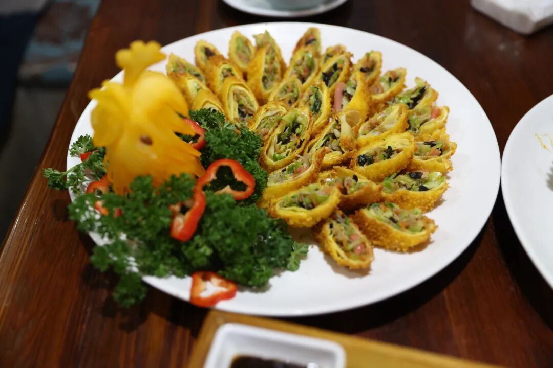 “孔雀开屏?”“江山如画?”创意菜品一端上来,美观优雅的造型吸引粉丝们纷纷猜起菜名。融媒主播红薇逐一揭晓答案:“炸蔬菜卷切好之后拼成凤凰的样子,这道菜叫‘望女成凤’,寄托着家长们的美好愿望。太好看了,有点不舍得吃。鸡蛋外皮焦香酥脆,里边有卷心菜、黑木耳、豆皮、火腿肠等。”