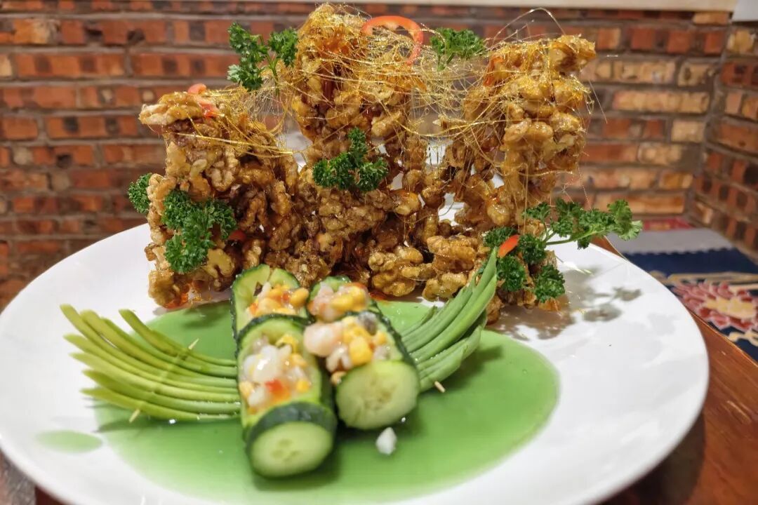 另一道创意菜品叫“寿比南山”,琥珀核桃仁堆成连绵山川,淋上一层金色的糖丝,蔬菜化为“青松”点缀,黄瓜小船“畅游”碧波之上,不但美观,更有趣味。
