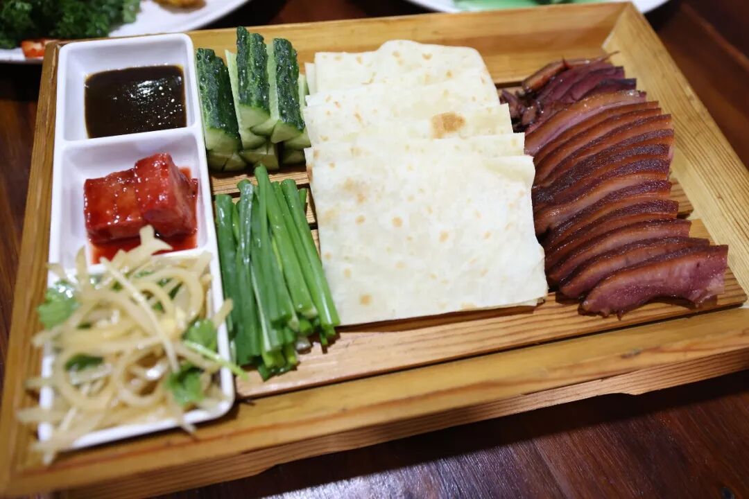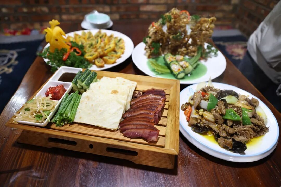 “从店里的木桌、火炕、大花布等装饰就能猜到,这里的菜品也一定不走寻常路。”融媒主播杨野为大家介绍其他的主打菜品,“都知道大饼夹一切,但这么精致、成套的大饼卷肉,我还是头一次见。”切好的大饼配上猪头肉片、黄瓜丝、小葱,再蘸一点酱豆腐或者秘制酱料,别有一番滋味。