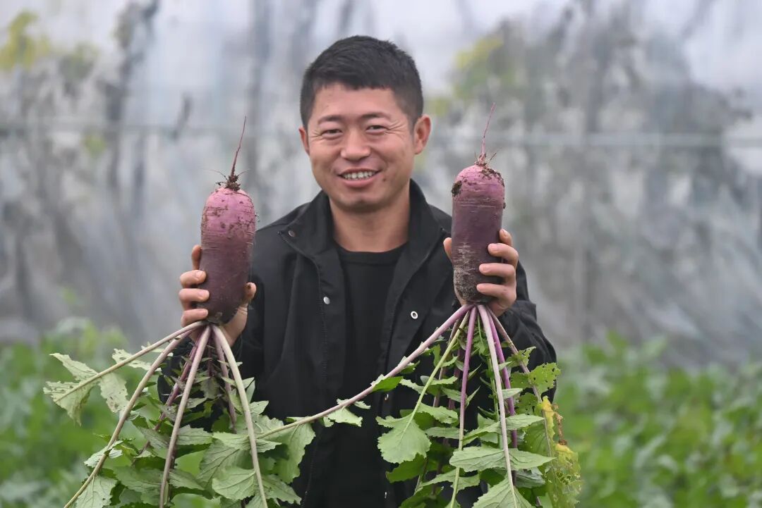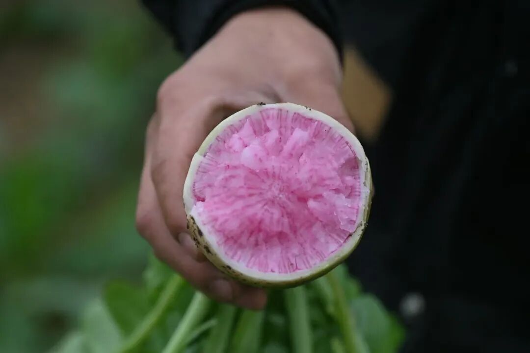 谢文学农场冷棚里的“紫霞”萝卜藏着冬日惊喜。浑圆的紫皮底下,藏着诱人的紫色糖心,一刀切开会看到天然的纹路分层。咬一口脆嫩得像咬开新鲜雪梨,汁水瞬间迸发,没有丝毫辛辣味,只剩纯粹的清甜,难怪被叫作萝卜界的“甜妹儿”。