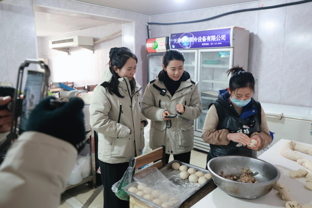 “好大的面皮!”顺着融媒主播红薇的声音看去,开放式厨房里,巧厨娘正在做吊炉烧饼的面皮。一米多宽的面皮上,抹上油酥,卷起来再揪成一个个面团子,包上猪肉大葱馅,送到吊炉旁,随吃随烤。