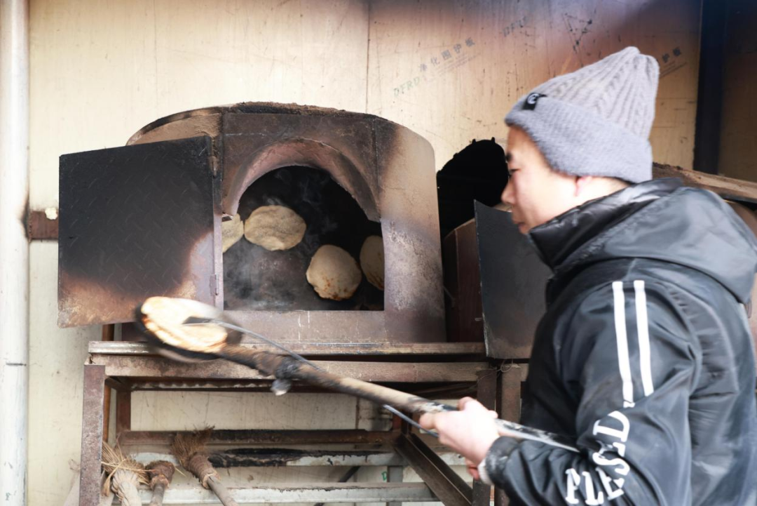 店主翟占超熟练地烤着烧饼,他说:“平均每天卖400个烧饼,有人喜欢脆一点的,有人喜欢软一点的,就看火候的掌握了。”