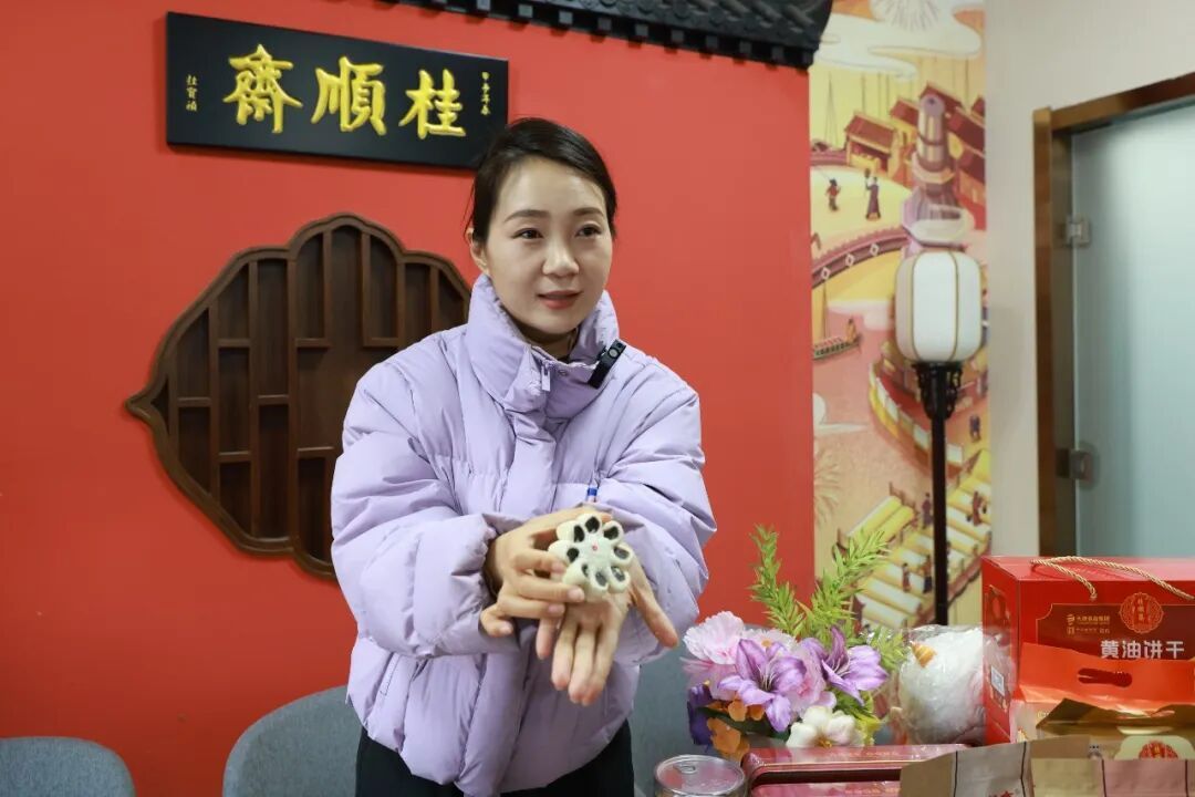 “提起桂顺斋,大家都不陌生,逢年过节大包小包拎回家。你们知道吗?桂顺斋生产基地已迁至宝坻三年了。”在样品间,从常见的喜字白皮、五仁白皮到新上市的全麦饼干、巧克力饼干,从百年老式模具到冰箱贴、IP娃娃“桂宝”,融媒主播晓晨目不暇接,瞬间“迷路”。
