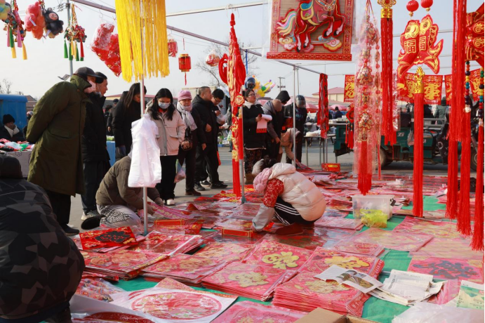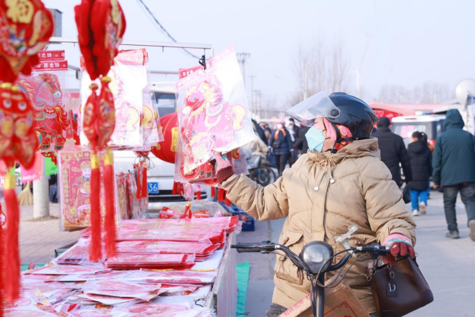 红艳艳的春联福字摊上,顾客们仔细挑选着。喜庆装饰沿着摊位延伸,灯笼、窗花、中国结在冬日阳光下熠熠生辉,将这里染成红色的海洋。