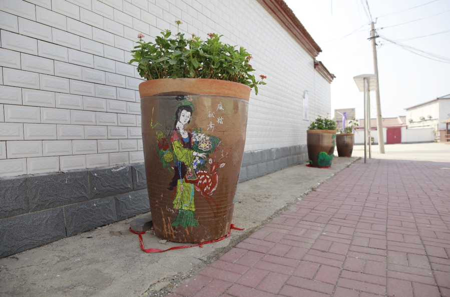 在大唐庄镇董塔村,也有类似的做法。村里主干路上错落有致地摆放了很多大水缸,画上了“京剧脸谱”“麻姑献寿”等带有中国传统文化色彩的图案。与六户村水培植物不同的是,这里以土栽为主。各色花儿开得正艳,为乡村振兴锦上添花。