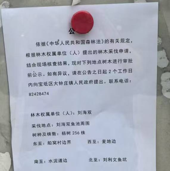 依据《中华人民共和国森林法》和《天津市林木采伐管理办法》的有关规定,现将我镇近期林木采伐申请进行公示,请广大群众进行监督。如有异议,请在公告之日起2个工作日内向大钟庄镇政府提出。