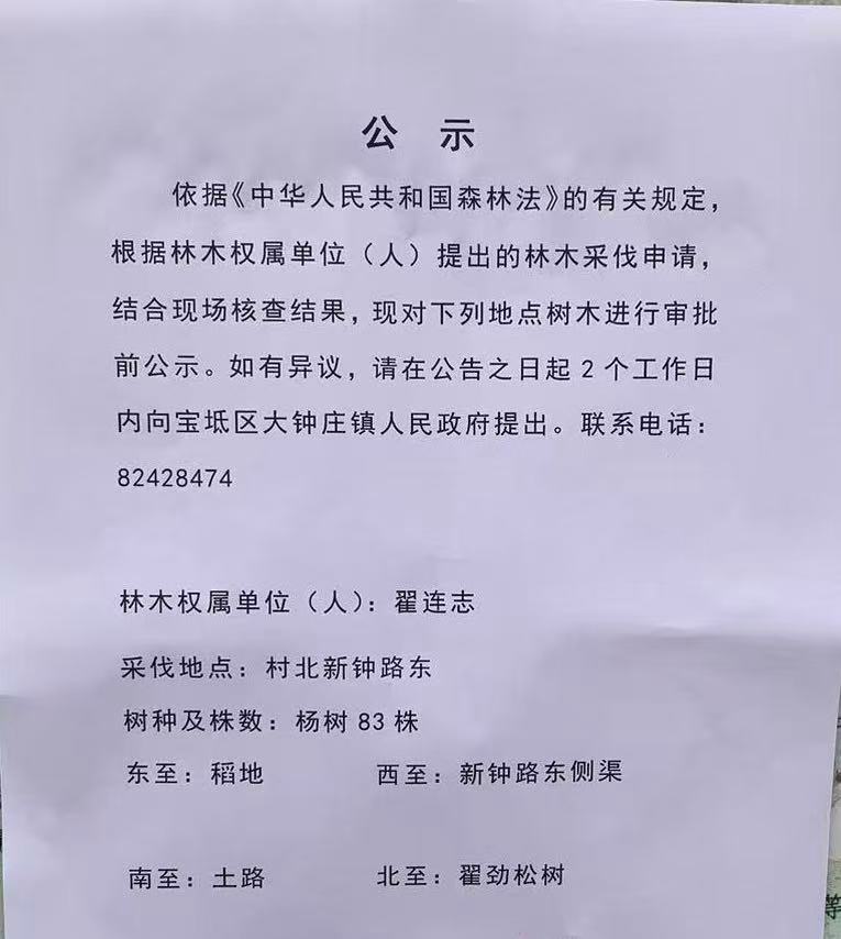 依据《中华人民共和国森林法》和《天津市林木采伐管理办法》的有关规定,现将我镇近期林木采伐申请进行公示,请广大群众进行监督。如有异议,请在公告之日起2个工作日内向大钟庄镇政府提出。