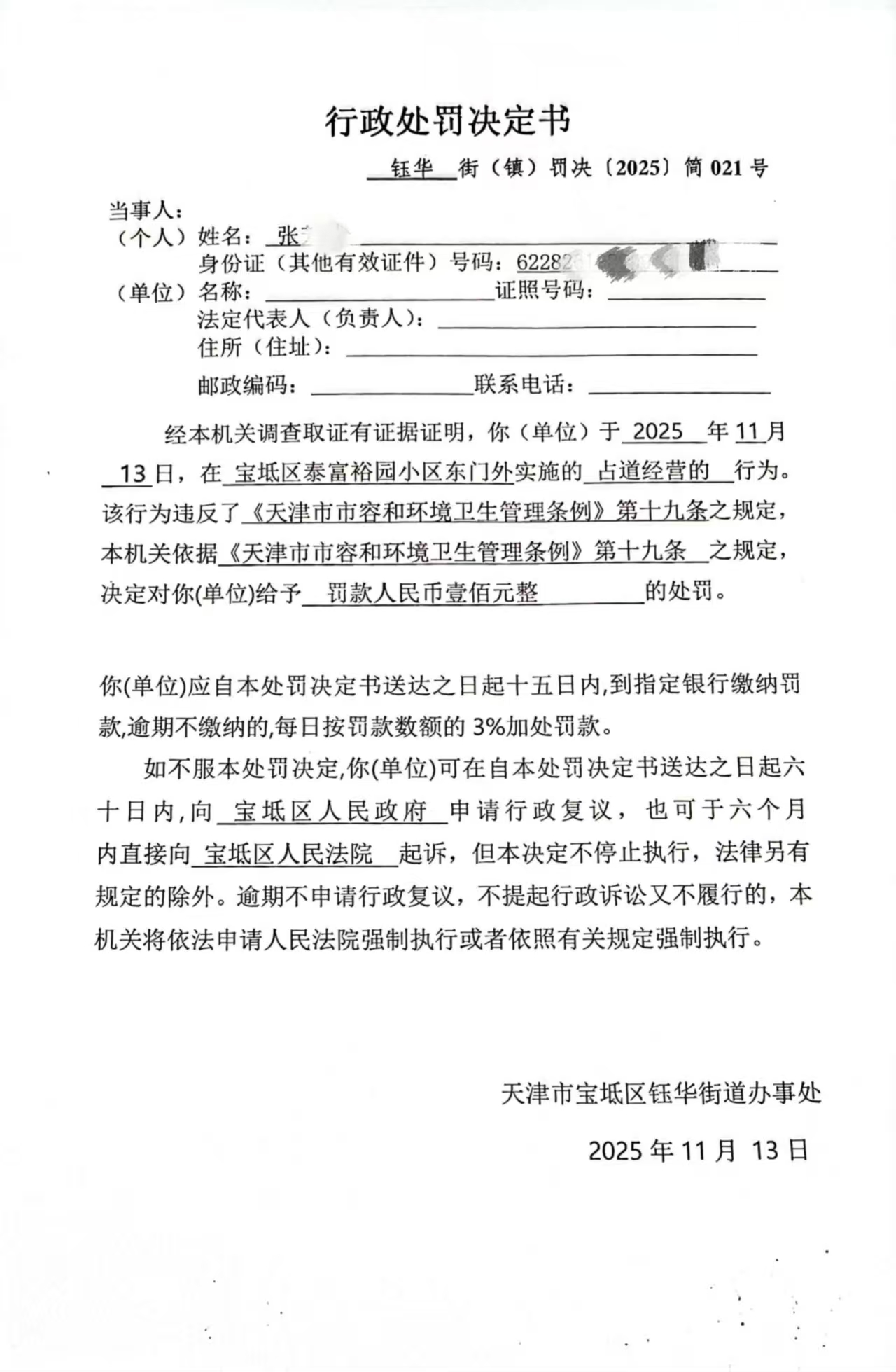 经本机关调查取证有证据证明,当事人姓名:张** 于2025年11月13日,在宝坻区泰富裕园小区东门外实施的占道经营的行为。该行为违反了《天津市市容和环境卫生管理条例》第十九条之规定,本机关依据《天津市市容和环境卫生管理条例》第十九条之规定,决定对当事人给予罚款人民币壹佰元整的处罚。