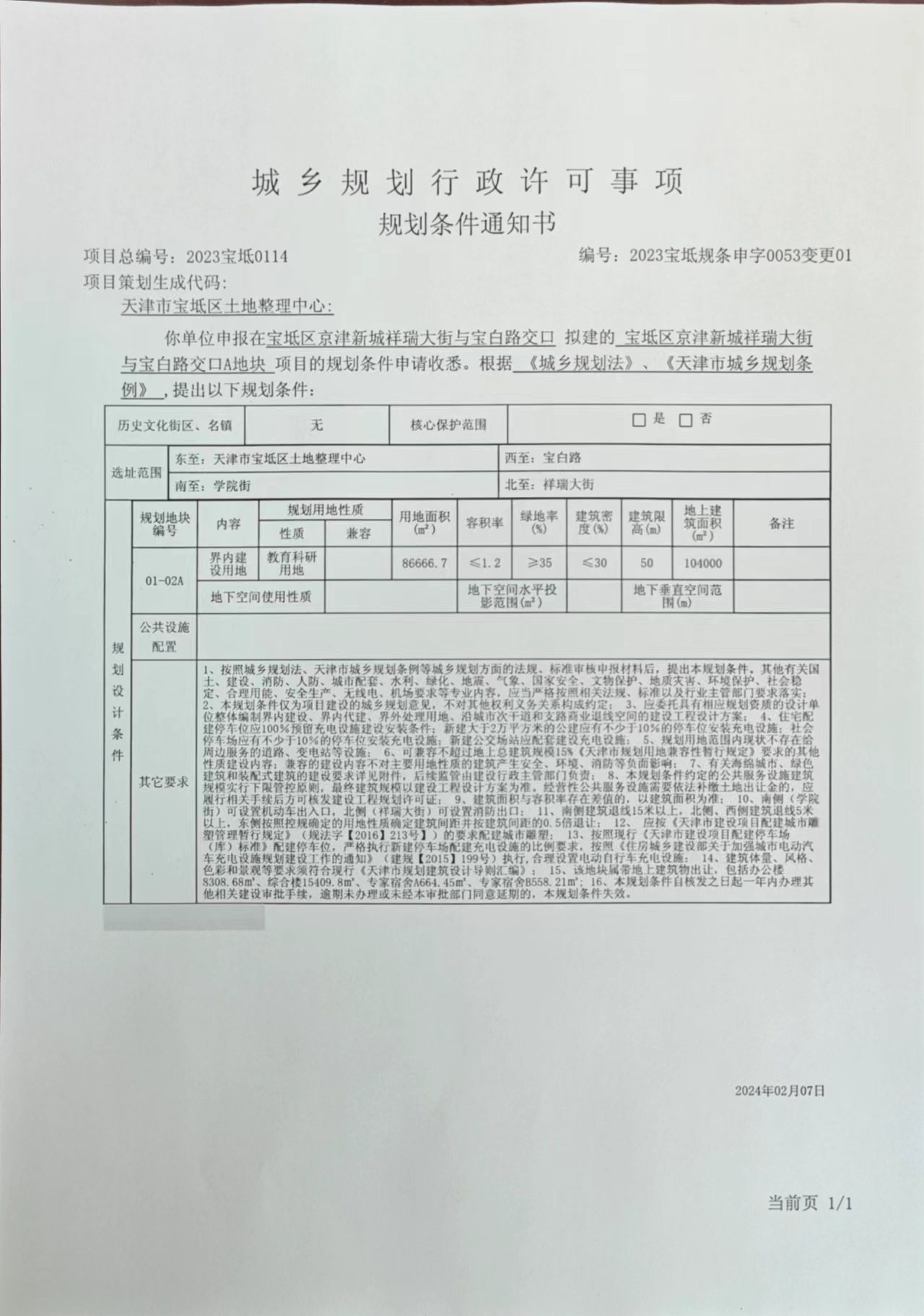 依据《中华人民共和国城乡规划法》和住房城乡建设部《关于城乡规划公开公示的规定》等相关规定要求,现将拟建的宝坻区京津新城祥瑞大街与宝白路交口A地块项目的规划条件进行批后公布,公布时间为7个工作日(2024年2月7--2024年2月21日)。