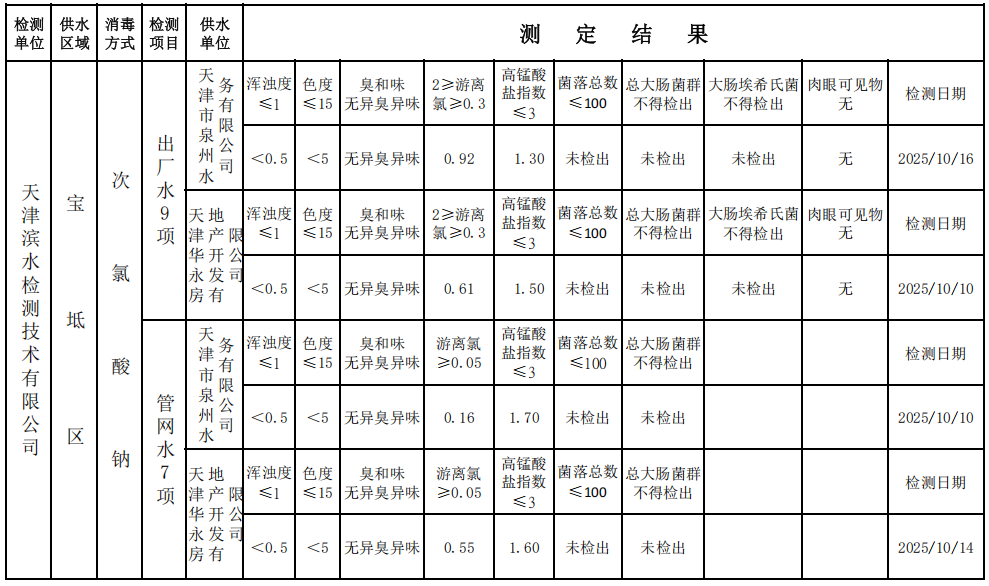 天津市宝坻区2025年11月份水质检测公示(10月份水质检测结果)